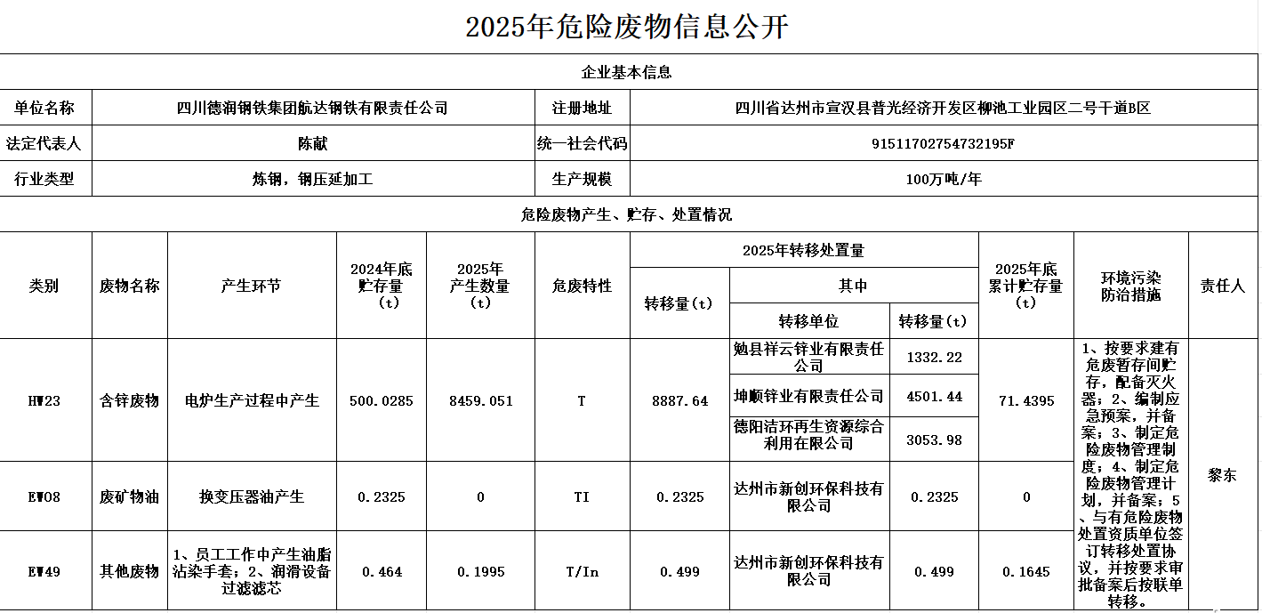 四川德潤鋼鐵集團航達鋼鐵有限責任公司2025年危險廢物信息公開